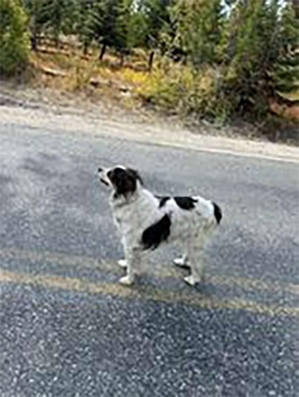 There, sitting all alone on the side of the forest-lined road, was a dog. In her eyes was a look of concern.