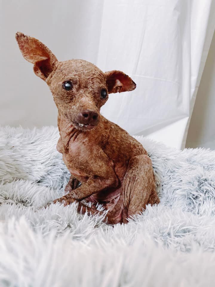 Frail and completely covered in scabs, the Chihuahua mix’s skin gave her a mummified look. She was labeled “at-risk” for euthanasia, but shelter volunteers refused to give up on her. Instead, they posted a video of Blondie online along with a plea for help.
