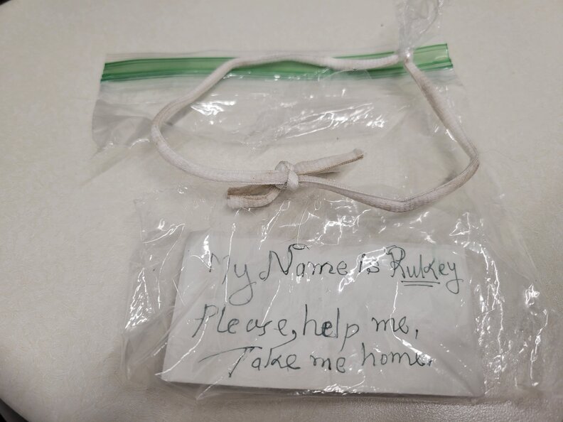 Around the dog’s collar was a piece of rope securing a little baggie with a note. The note read simply: “My name is Rukey. Please help me, take me home.”