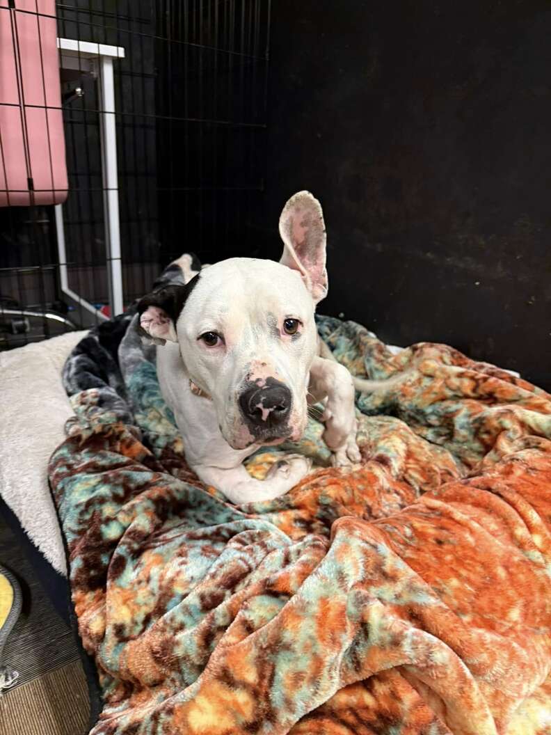 At the rescue, the dog, who’s about 2 years old, immediately took advantage of her new digs, cuddling up in blankets and on soft beds. Going from a cold floor to a warm blanket gave her rescuers the perfect idea for a name: Comfy Cozy.