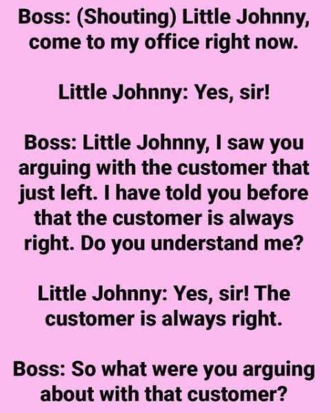 Boss: (Shouting) Little Johnny, come to my office immediately.Little Johnny: Yes, sir! Boss: Little Johnny, I noticed you arguing with the customer who just left. I’ve told you before that the customer is always right.