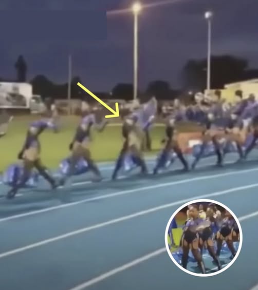 The video showed the team, each girl wearing full makeup and high ponytails, performing as the marching band passed by.