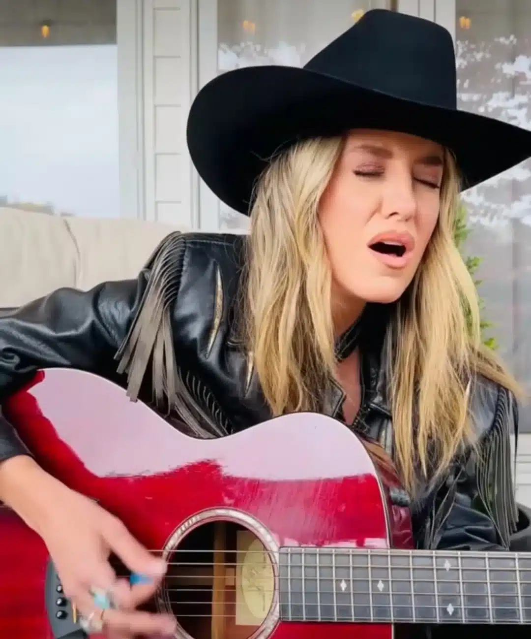 Sitting on a front porch illuminated by soft autumn light, Wilson looked every bit the country outlaw in a black fringe leather jacket, sleek black cowboy hat, and red acoustic guitar resting in her lap. The minimalist setup let her voice take center stage — smoky, emotive, and full of quiet ache.