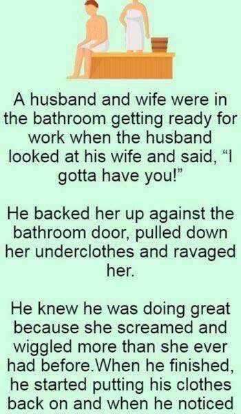 A husband and wife were in the bathroom getting ready for work when the husband looked at his wife and said, “I gotta have you!” He backed her up against the bathroom door, pulled down her underclothes and ravaged her.