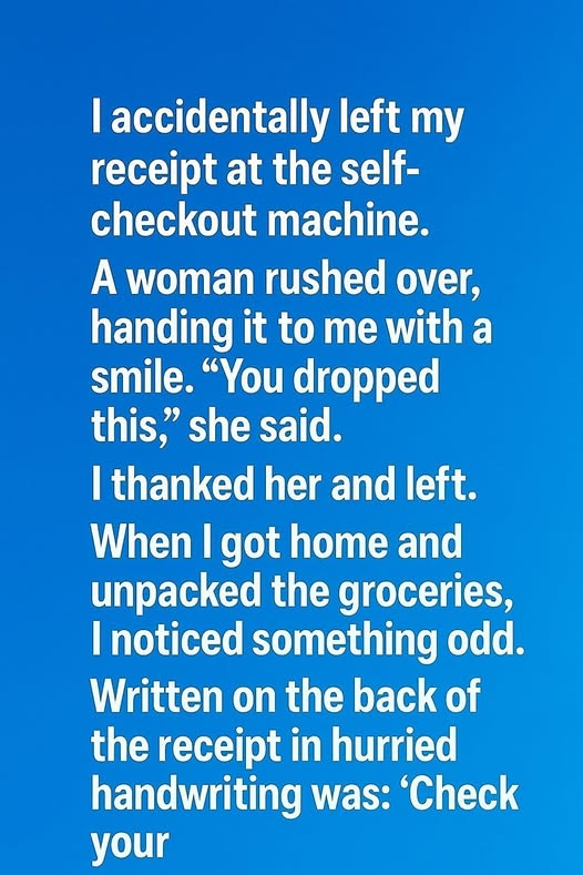 Later that evening, I unpacked my groceries, humming softly to myself — milk, bread, pasta, the usual. As I was cleaning up, I noticed the receipt sitting on the counter. Something caught my eye.