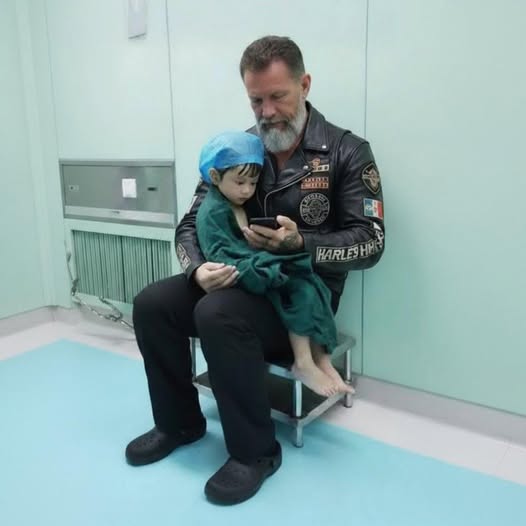 To her surprise, Liam asked to speak to him. His small voice carried a power no one could resist. The man—Mike—knelt, his presence gentle despite his size. They talked about motorcycles, about Liam’s dad who had once dreamed of riding before dying overseas. The child, frail and brave, saw something in Mike that reminded him of the father he missed. Then, softly, he asked the question that stopped every heartbeat in that room: “Can you hold me? Mama’s tired.” His mother’s arms weren’t tired—only her heart was—but she nodded. Mike lifted Liam like something sacred. The boy rested against the biker’s chest, whispering, “You smell like my daddy.” For the first time in months, he fell asleep without pain. Around them, nurses paused, strangers wiped their eyes, and a mother learned that love sometimes wears leather and tattoos instead of halos.