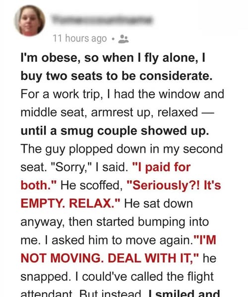 For a recent work trip, I paid an extra $176 from my own pocket for a second seat—money I really didn’t have to spare, but I valued my comfort and dignity more. When I boarded, I took my window seat and the middle seat beside it, exhaling with relief. For once, I wasn’t going to spend a three-hour flight feeling ashamed or in someone’s way.