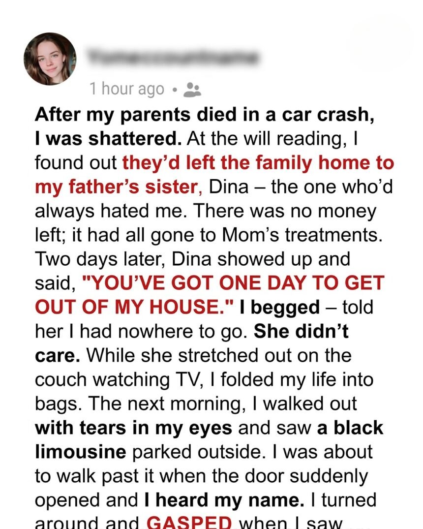 My Aunt Kicked Me Out of My Childhood Home After My Parents Died – Just as I Left Crying, a Black Limo Pulled Up