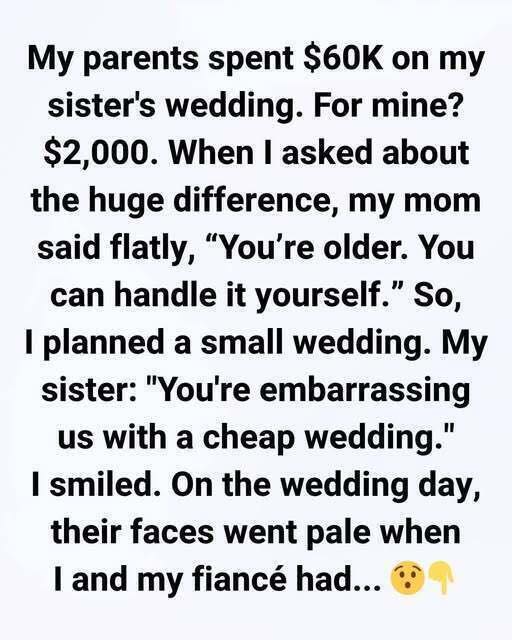 When my parents spent $60,000 on my sister’s wedding, I clapped and smiled through the whole thing. It was beautiful, of course — a grand ballroom glowing with chandeliers, a ten-piece band, a five-tier cake, and flowers that looked like something out of a royal garden. I stood by her side as maid of honor, holding her bouquet and pretending not to notice how easily the money flowed for her every wish. I never said a word about fairness or comparison; it was her special day, and I wanted her to have it. But deep down, I thought that when my turn came, they’d show me the same love and excitement. I thought wrong.