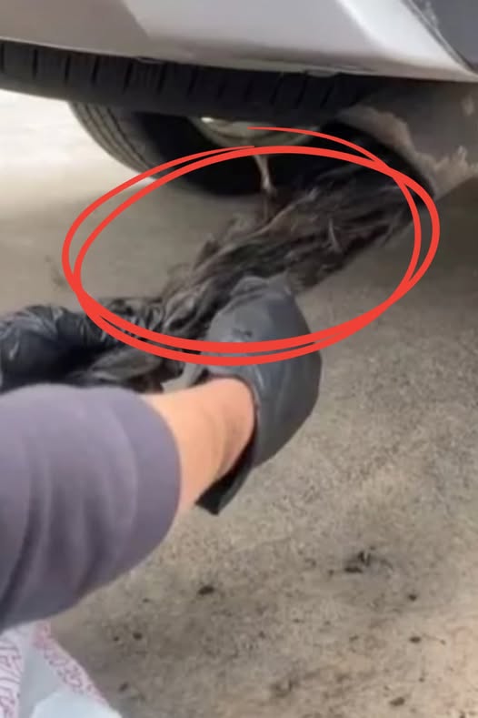 What started as a routine drive quickly turned eerie when a woman and her family spotted something strange hanging from their car’s muffler. At first, it looked like thick strands of human hair—enough to cause immediate alarm.