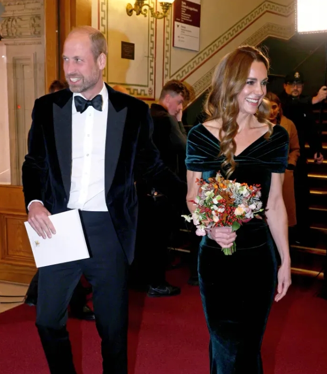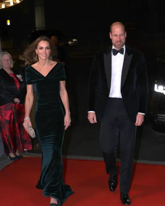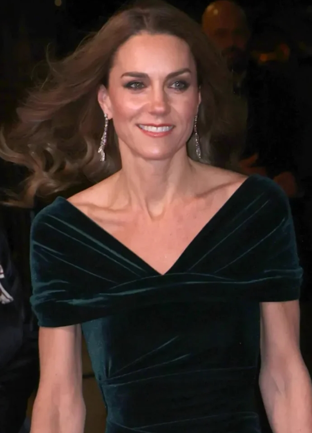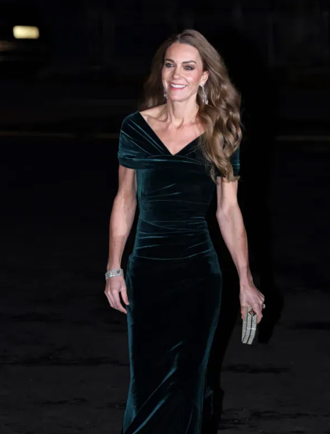 Her latest appearance, a charity gala alongside Prince William, felt like a symbolic moment: a quiet but powerful return. Kate arrived in a deep dark-green velvet gown that shimmered under the lights, elegant yet understated. Paired with diamond earrings and her signature cascading curls, she looked every bit the modern royal—refined, poised, and heartbreakingly strong.