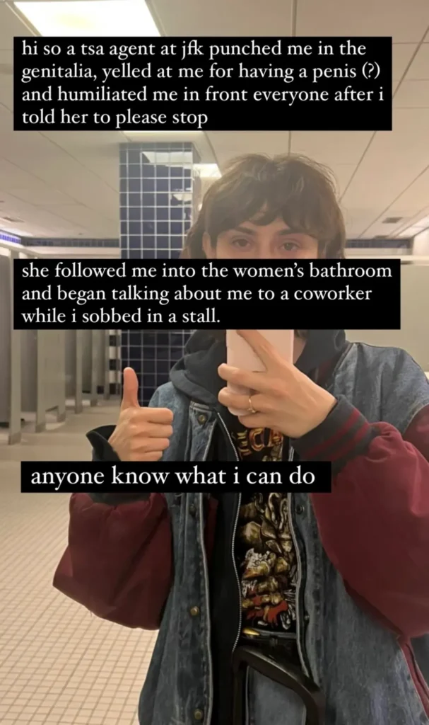 “hi so a tsa agent at jfk airport punched me in the genitalia, yelled at me for having a penis (?) and humiliated me in front of everyone after i told her to please stop,” she wrote, alongside a photo of her crying in an airport bathroom.
