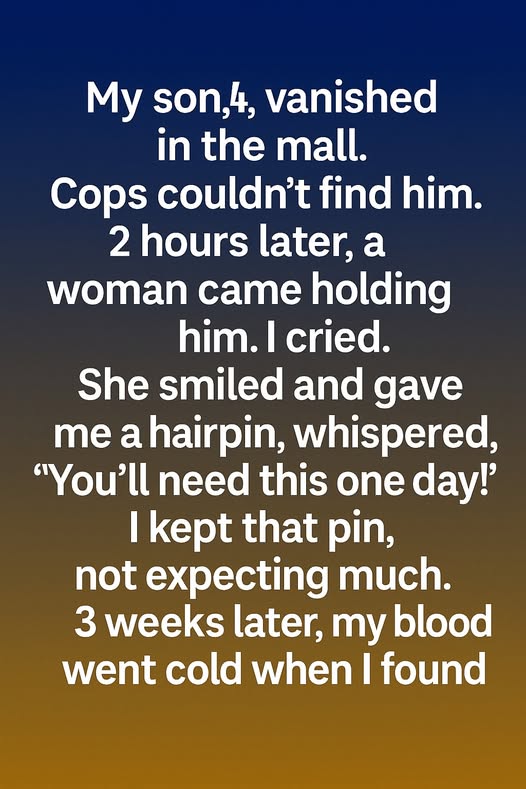 My son, 4, vanished in the mall. Cops couldn’t find him. Two hours later, a woman came holding him. I cried. She smiled and gave me a hairpin, whispered, “You’ll need this one day!” I kept that pin, not expecting much. Three weeks later, my blood went cold when I found that same hairpin resting on my kitchen counter, though I clearly remembered placing it inside a sealed drawer the night before. At first, I told myself it was simple forgetfulness brought on by stress. But the more I stared at the tiny silver pin, the more I realized something about it felt unusual—almost purposeful. My son toddled into the room, humming a tune I’d never heard before, one he claimed the “nice lady” had taught him. Every time he hummed it, the hairpin seemed to shimmer faintly, catching the light in a way that didn’t seem quite natural. I couldn’t shake the feeling that the woman hadn’t just returned my son—she had left something behind.