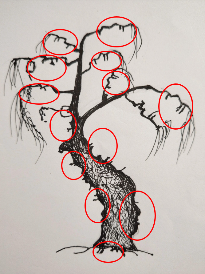 The tree’s canopy is formed by the outlines of human faces—each one unique, each one silently observing. Some look calm, others pained, and a few seem lost in contemplation. It’s like the tree is a collection of souls, memories, or perhaps whispers of time gone by. This isn’t just a clever trick of lines. It’s a message: nature sees us, remembers us, and in a strange way, becomes us.