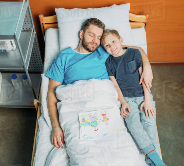 Little boy sitting on hospital bed and looking at sick father, dad and son in hospital