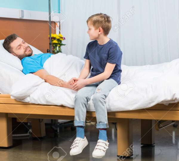Little boy sitting on hospital bed and looking at sick father, dad and son in hospital