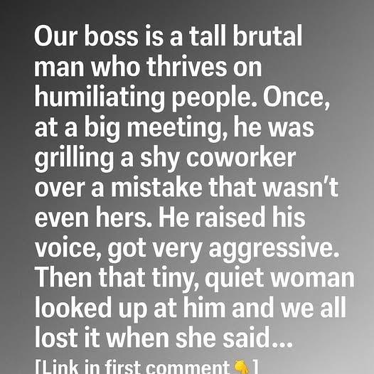 Our boss is a tall brutal man who thrives on humiliating people. Once, at a big meeting, he was grilling a shy coworker over a mistake that wasn’t even hers. He raised his voice, pacing like he wanted the whole room to feel just as small as the woman sitting across from him.