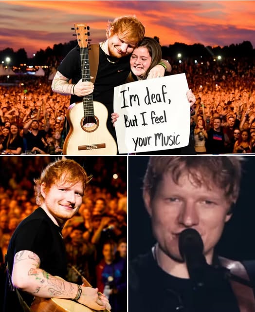The moment unfolded when Sheeran noticed someone in the front row holding a sign that read: “I’m deaf, but I feel your music.” Visibly touched, he stopped the show, stepped toward the edge of the stage, and warmly motioned for the fan to join him under the spotlight.
