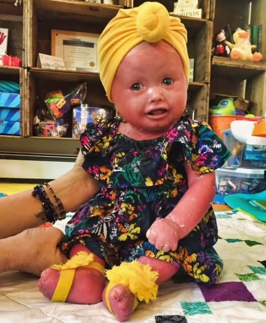 Today, Anna’s life is sustained by an intense routine that touches every hour of the day. She requires multiple long baths to soften and shed excess skin, followed by frequent applications of medical ointments to keep her skin flexible and protected. Her body burns enormous energy regenerating skin, so she consumes around 2,100 calories a day—more than many adults. Jennie made the difficult decision to leave her career and become Anna’s full-time caregiver, managing therapies, treatments, and medical monitoring with unwavering devotion.