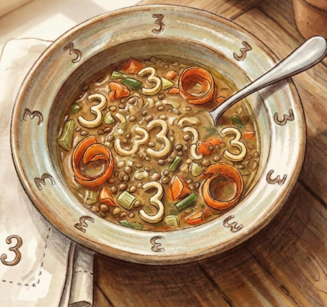 At first glance, the image looks simple: a bowl of soup sitting on a wooden table, nothing unusual at all. But the longer you stare, the more your eyes catch small curves and shadows that resemble familiar shapes. Slowly, hidden symbols appear, and many viewers notice the number three repeated throughout the picture.