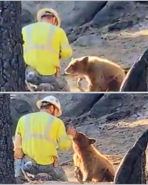 One afternoon, a wildlife photographer, working in the region, happened upon the scene. From a distance, he captured an image: the logger kneeling quietly a few yards from the den, his eyes fixed on the cub. The expression on his face told the story better than words ever could — grief, empathy, exhaustion, and fierce love without expectation.