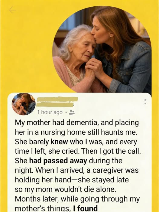 It wasn’t just memory loss. It was watching someone slowly drift away while their body stayed behind. Some days she knew my name. Most days, she didn’t. And every time I left her room at the nursing home, she cried like I was abandoning her all over again.