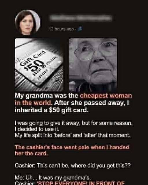 When my grandmother passed away, I assumed the only thing she left behind was a simple $50 gift card—barely the kind of inheritance anyone dreams of, yet entirely appropriate for a woman famous for her remarkable thriftiness.