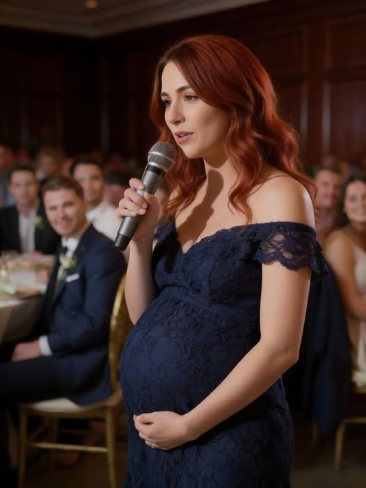 She appeared at the back of the ballroom in a simple white dress, one hand resting protectively over a rounded belly. The music faltered. Glasses paused mid-air. Whispers rippled through the room.