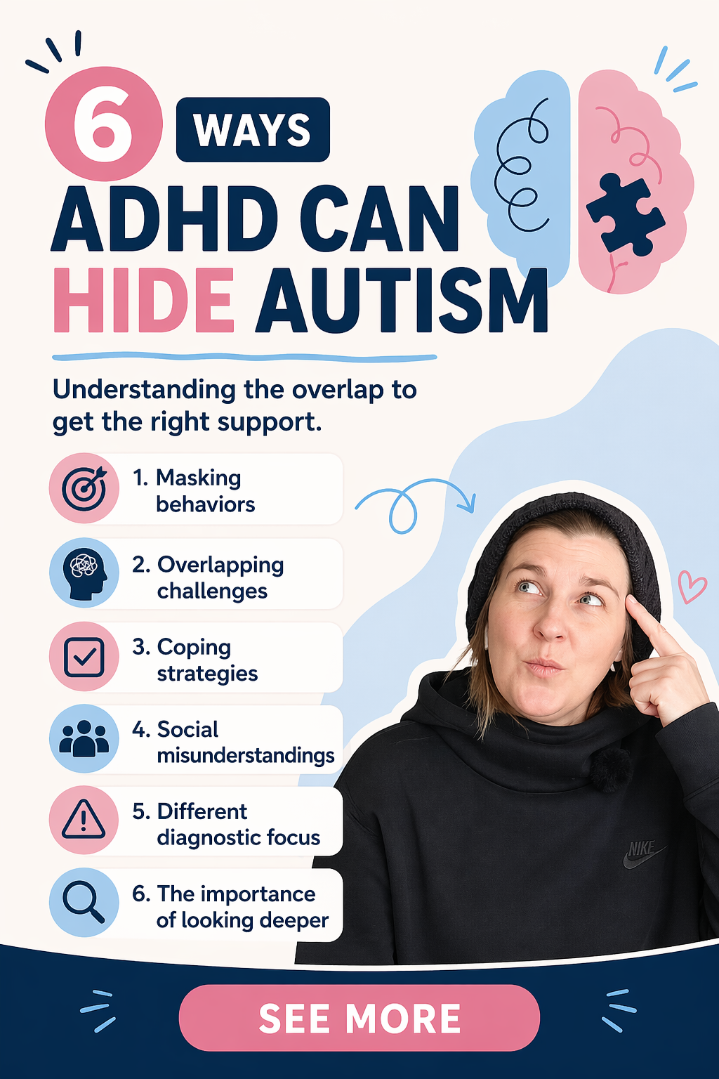 This pattern came up again and again in a survey I conducted with over 700 AuDHD adults for my upcoming book, AuDHD Unlocked, years of partial recognition before the full picture came into view. Clinicians call this diagnostic overshadowing: when traits that could belong to multiple conditions get automatically attributed to the first diagnosis. Research bears this out: when ADHD is identified before autism, autism recognition is delayed by an average of 1.8 years, and closer to 2.6 years for girls.