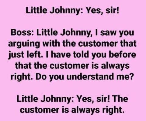 Boss: (Shouting) Little Johnny, come to my office immediately.Little Johnny: Yes, sir! Boss: Little Johnny, I noticed you arguing with the customer who just left. I’ve told you before that the customer is always right. Do you understand? Little Johnny: Yes, sir! The customer is always right. Boss: So, what were you arguing about with…